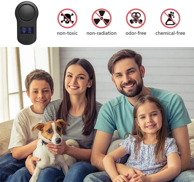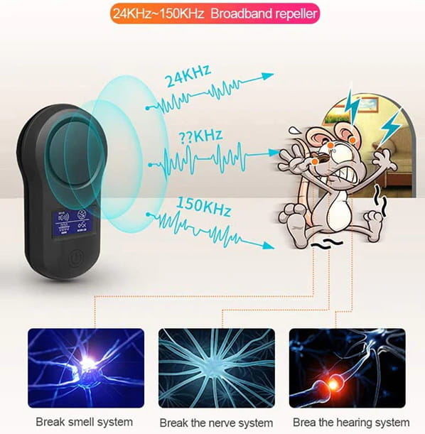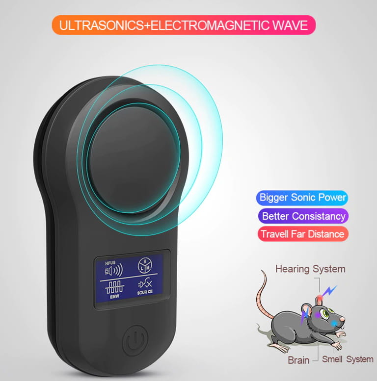 Skuteczność urządzenia opiera się na falach elektromagnetycznych oraz falach ultradźwiękowych o częstotliwości 22khz-150khz która jest nieodczuwalna dla człowieka. Odstraszacz może pracować, nawet przy małych dzieciach.